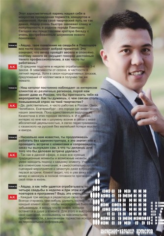 -Айдар, твоё появление на свадьбе в Павлодаре все гости называют доброй приметой - это означает, что вечер пройдёт весело и спокойно, поэтому никого не смущает гонорар, достойный твоего профессионализма, а как часто ты работаешь?