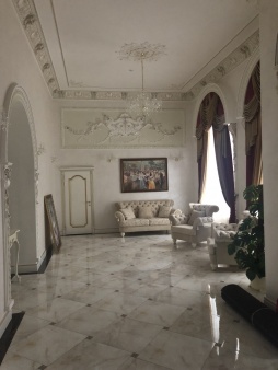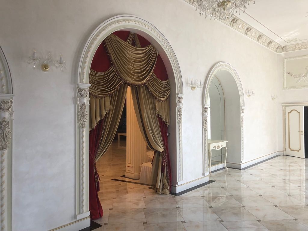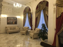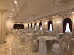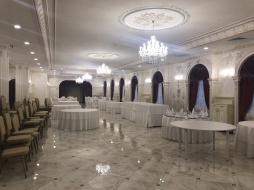 Повсюду пахнет новизной, свежим ремонтом, и праздником! Внушительная площадка для сбора гостей, там достаточно места и для фото зоны, и для фуршетной линии и даже для инструментального квартета. Зал выдержан в светлых тонах, широкие оконные пространства с красивейшими балдахинами, высокий сценический подиум для вокально-инструментального ансамбля. Банкетная рассадка рассчитана на 250 персон, зал представляет собой коридорную планировку в виде длинной череды банкетных столов на 10 персон каждый. Центр зала для произнесения тостов и выступлений промежуточных артистов.