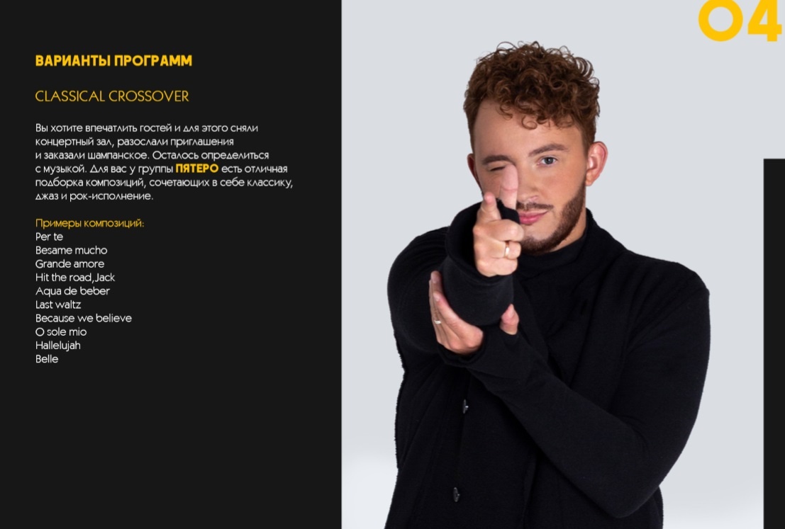 Парни удивляют каждой своей композицией! Достаточно посмотреть всего один ролик и вы уже мысленно представите группу Пятеро на своём мероприятии. Более того вы даже невольно начнете предвкушать их неминуемо бурную реакцию на выступление группы Пятеро! Уникальность данного коллектива для наших шоу в абсолютной приспособленности. Ведь зачастую слуховой дискомфорт у гостей начинается уже во время сбора гостей, когда салонный сет инструментального репертуара группы звучит громче чем хотелось бы. Благодаря отточенной форме подачи, группа Пятеро гармонично вливается в любой из сценарных пробелов, заполняя его исключительным плей листом.