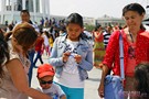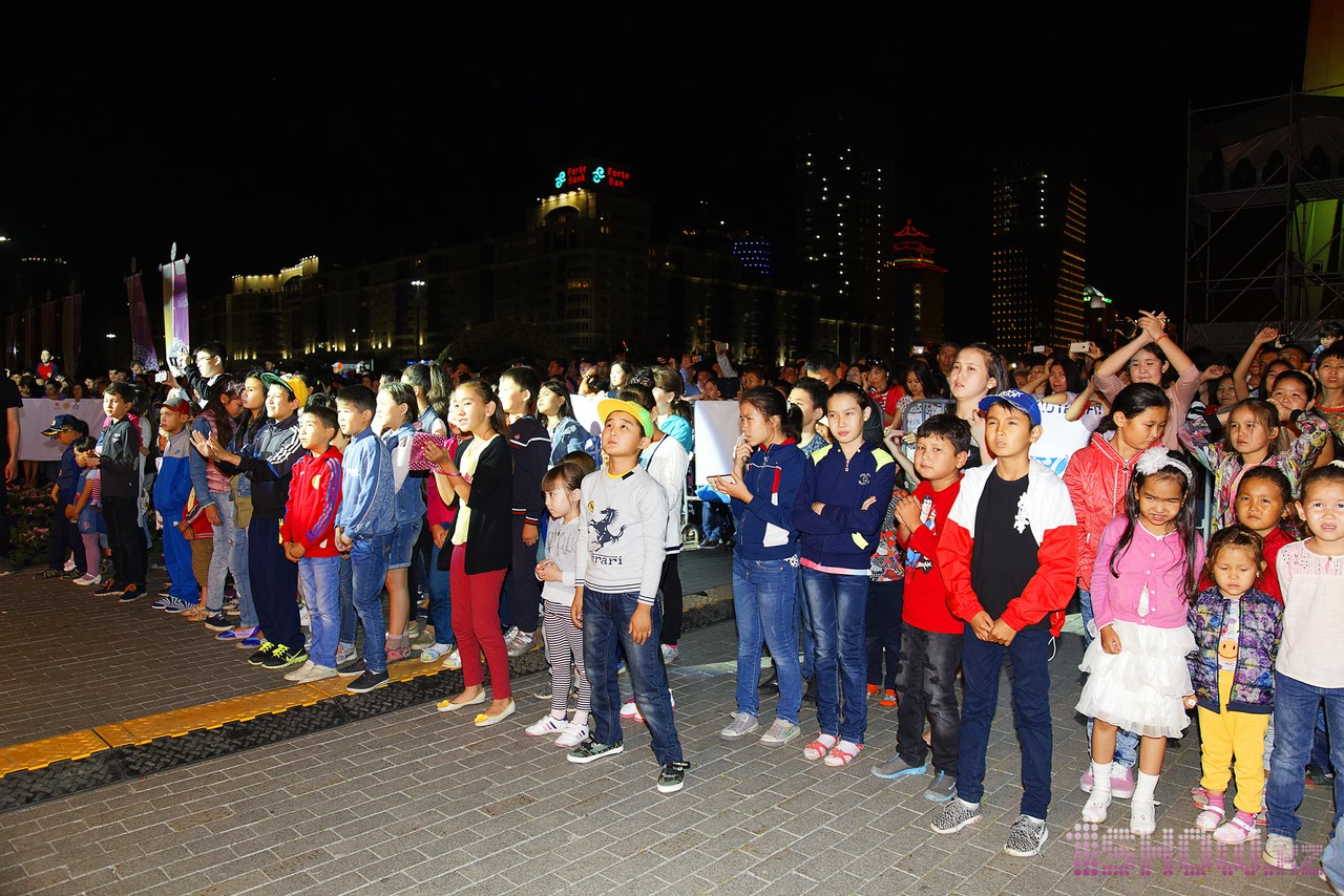 После выступления. Жанар Дугалова и Дос.Но это еще не все. Дети прошли сквозь ограждения и смотрели на Алмаса и Жанар вблизи, пока они пели. Смотрелось довольно трогательно: дети снимали всё на камеры своих телефонов с большущими глазами, раскрытыми ртами, некоторые стояли неподвижно, будучи в шоке, видимо. Но глаза стали еще больше, а рты раскрылись еще шире, когда Жанар Дугалова во время «Айта Берсын» спустилась к детям, об этом есть видео.