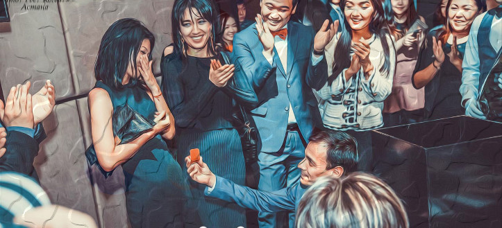 Всё начиналось вполне официально. «Что? Где? Когда?» переехал на новое место – теперь игры будут проводиться в мьюзик-баре «Zvuk». Зрители и знатоки сидели за столиками в ожидании игры между командами Адиля Джусупова и Шухрата Адилова. Всё как и всегда: неторопливо, в общении, в знакомствах. Вот, диктор приглашает всех пройти в игровую зону, и волчок выбирает команду, которая сыграет первой – это была команда Адиля Джусупова. В этот момент уже идет прямой эфир в инстаграме «chto_gde_kogda» - свидетелями помолвки благодаря трансляции стало на 30 человек больше.