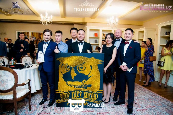Художники @emily_show_kz разместили на сцене первого этажа «Традиционаля», черное полотно. Как нетрудно догадаться, это картина золотой пылью – пока не осыпешь полотно золотом, она не проявится. Для этой красочной церемонии были приглашены капитаны-финалисты. Набрав в руки горсти пыли, Шухрат и Абдугани принялись бросать ее на картину. Получилась наша сова «Что? Где? Когда?», которая, как выяснилось, почетно будет вручена чемпионам Летней Серии. У команды Шухрата Адилова прибавилось мотивации защитить свой титул!
